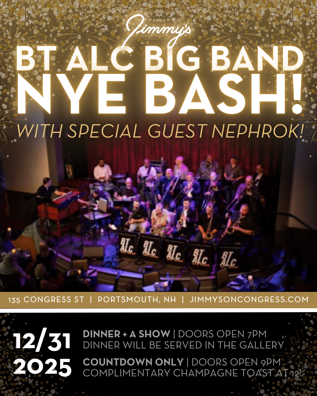 Ring in 2026 at Jimmy’s with an unforgettable New Year’s Eve celebration featuring BT ALC Big Band and special guest Nephrok! This is the NYE party Portsmouth talks about all year. We’re bringing all the funk, soul, and party-energy you need. Come celebrate in style at Jimmy’s.