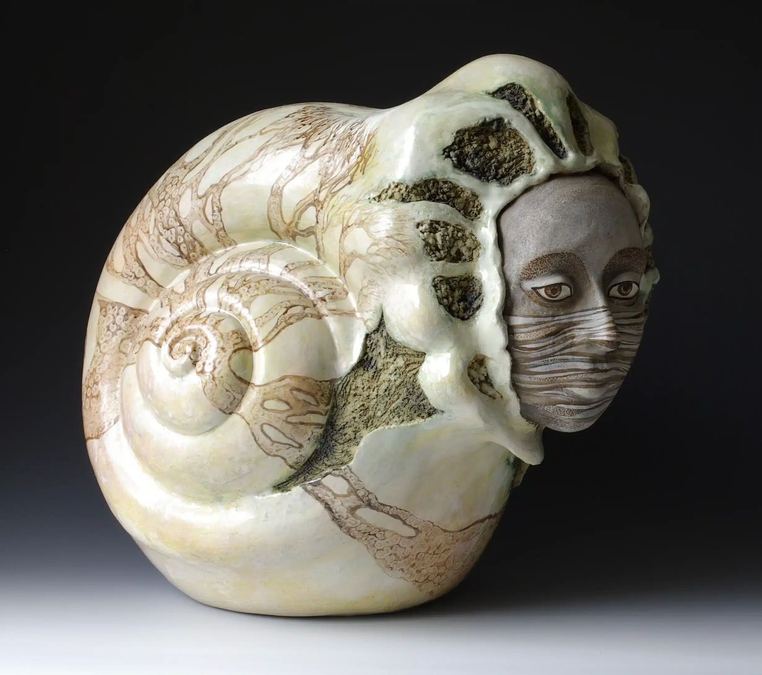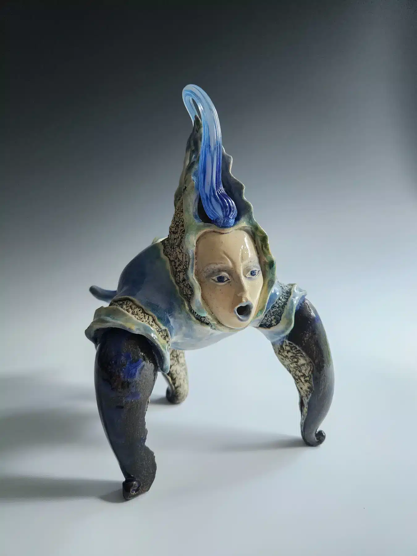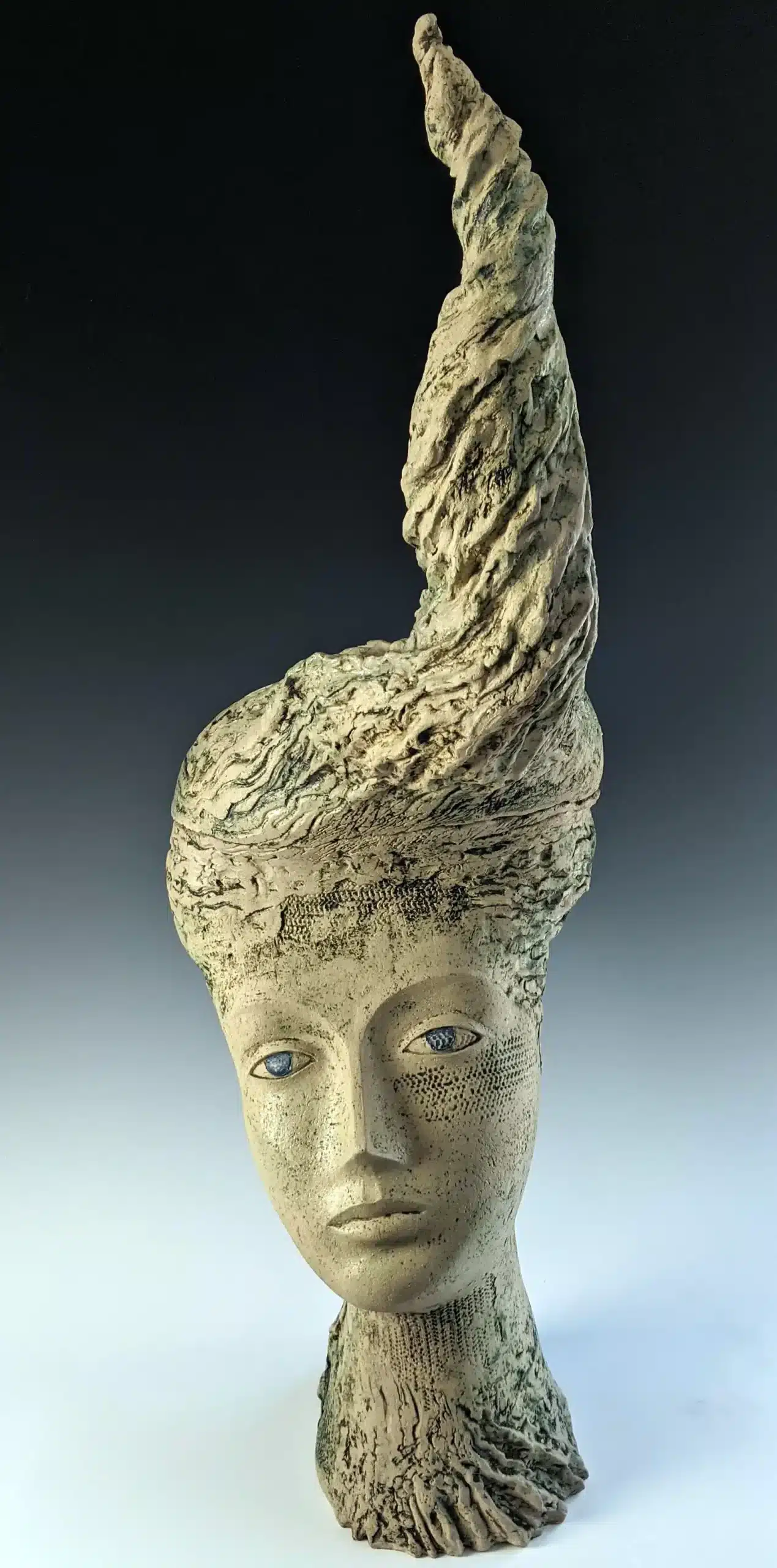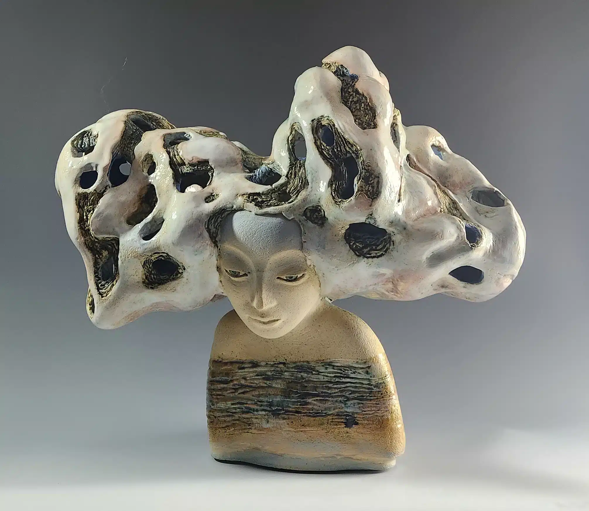 My sculptures converge the elements of clouds, birds, tears, and rubble. Through the juxtaposition of clay and glass, this series evokes a sense of translucency and fragility, each material lending its own texture to the narrative. Smooth tears of sorrow shine while the clay churns with the chaos of our troubled world. Multiple eyes gaze outwards, bearing witness to the unfolding drama, while a healing hand extends from within, offering a glimmer of hope in the middle of the devastation. Drawing with negative space, I let light penetrate the cracks and ruptures. These sculptures are not just artifacts of war; they are beacons of transformation, inviting us to confront the darkness within and emerge into the light of healing and renewal.