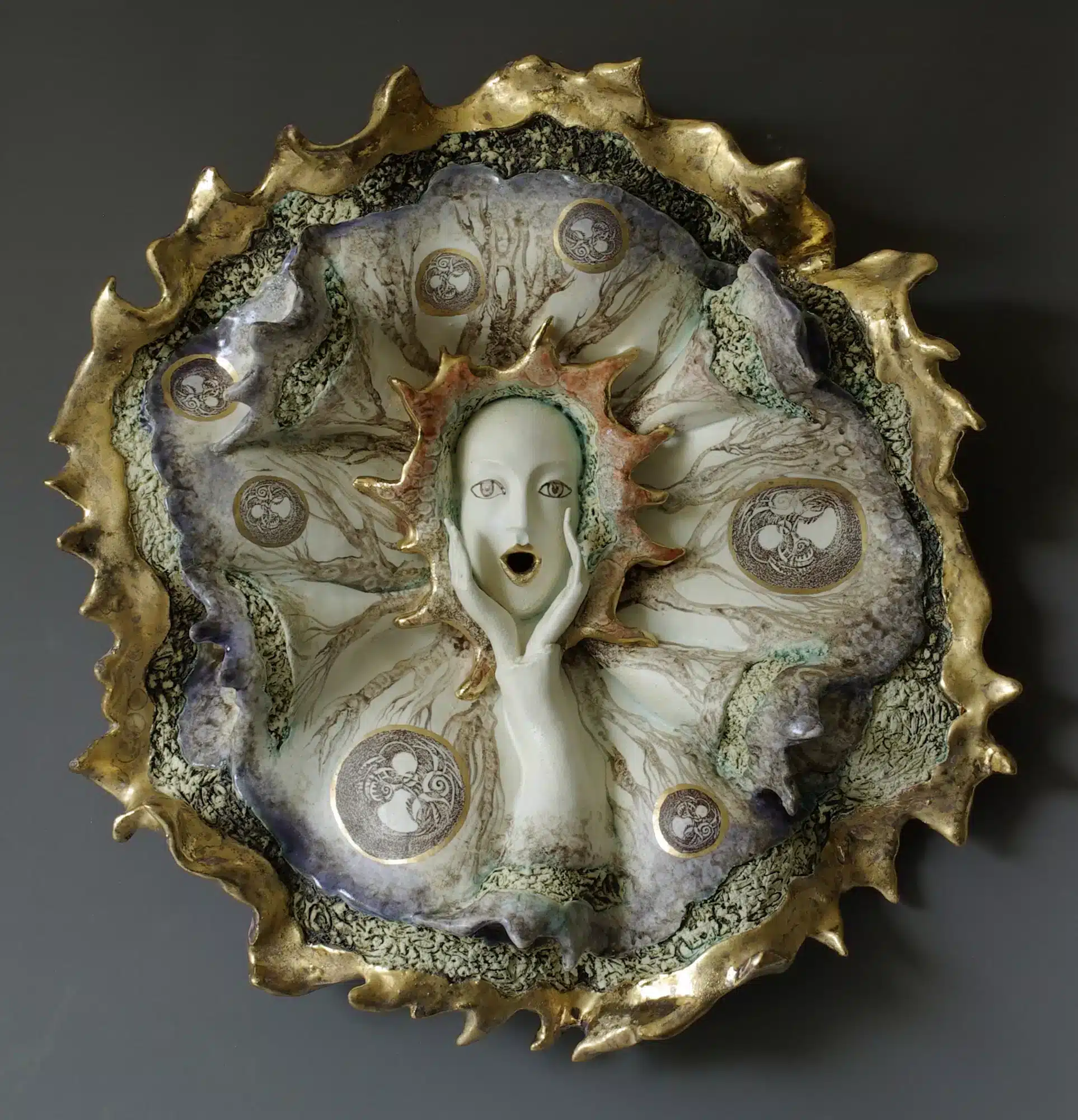 13″ x 13″ x 4″ stoneware, stains, glazes, china painting